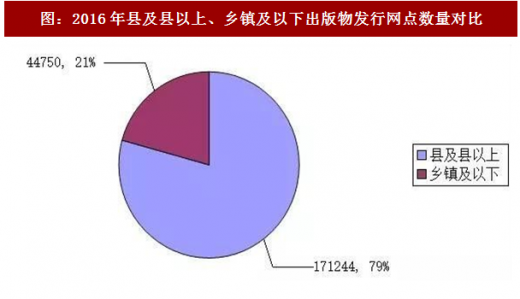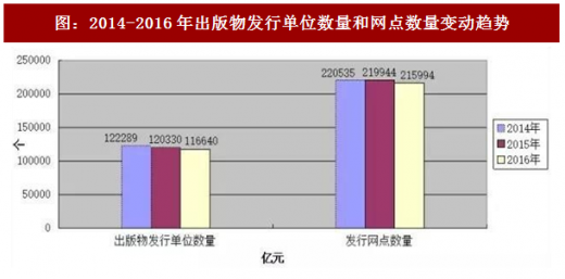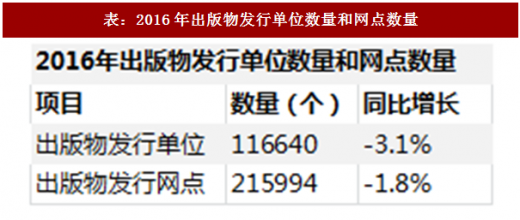 截至2016年底,全国共有出版物发行单位116640家,比上年减少3.1%;出版物发行网点215994个,比上年减少1.8%,连续三年呈小幅下降趋势。其中,县及县以上发行网点171244个,比上年减少0.5%;县以下发行网点44750个,减少6.4%。