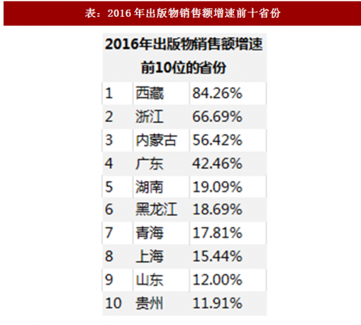 二、销售增长情况从销售额情况看,2016年,出版物销售额排名前10位的省份分别为北京、江苏、湖北、山东、湖南、浙江、广东、江西、安徽、河南,其出版物销售额占全国的69.7%。从销售额增速看,西藏、浙江、内蒙古、广东、湖南、黑龙江、青海、上海、山东、贵州排名前10位,均实现两位数以上的增长。其中,西藏、内蒙古、广东、黑龙江、青海、贵州均为新进入前10名的省份,西部省份占据了4个席位。