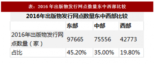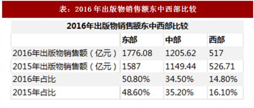 2016年,东部地区9省(市)出版物销售额为1776.08亿元,占全国的50.8%;出版物发行网点97665个,占全国的45.2%。中部地区10省出版物销售额为1171.31亿元,占全国的33.5%;出版物发行网点74351个,占全国的34.4%。西部地区12省(区、市)出版物销售额为551.31亿元,占全国的15.8%;出版物发行网点43978个,占20.4%。