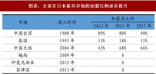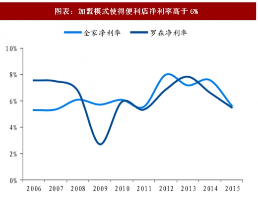日系三大便利店本土加盟比例均超过95%,平均净利率高于6%。在成熟市场,三大便利店统一采用高加盟比例经营模式,7-11、罗森、全家在日本本土的加盟店占比分别高达 98%/95%/97%。而在新进市场,三大便利店一方面与当地企业代理合作以实现本土化经营,另一方面也在逐步提高加盟比例。在进入新市场的早期,加盟店的比例通常较低,且会根据加盟店的经营情况进行调整。在实现较高品牌知名度、适应本土经营的标准化模式成熟后再逐步开放加盟。以全家为例,全家在近年新进入的越南、印尼、菲律宾等新兴市场均尚未开放加盟,而在早期进入的中国台湾、中国大陆、泰国等市场逐步提高加盟比例,目前台湾地区加盟店比例已经达到90%,大陆地区加盟店比例快速提升至66%,泰国虽然已经开放加盟,但加盟比例仍在不断调整中。加盟模式使得便利店的盈利能力远高于一般超市企业 2%-3%的净利率,全家和罗森巅峰时期净利率接近8%,近年来随着新兴市场拓展加快净利率有所下滑,但2006-2016 年平均净利率均高于6%。