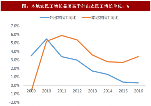 本地农民工人数增速高于外出农民工人数增速超2个百分点,说明三四线城市是农民工流出一二线大城市的主要目的地。根据统计局数据,我们可以从图中看到本地农民工同比增速显著高于外出农民工同比增速,2016年本地农民工增速达到3.44%。越来越多的农民工选择在就近的低线城市中就业。目前市场上对于流出一线城市的人口是否就是回到三四线城市存在疑虑,农民工增速数据证明三四线城市人口承接潜力仍然十分巨大。