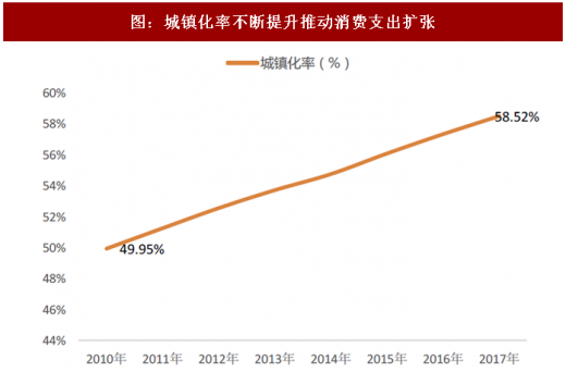 有助于提高过去农村人民的生活水平,进一步缩小城乡差距,加快城乡交互速度。国家统计局的数据显示,我国的城镇化率从2010年的49.95%上升至2017年的58.52%,平均每年增长1.22%,正处于高速增长期。2014年新华社发布《国家新型城镇化规划(2014—2020年)》,提出要有序推进农业转移人口市民化、优化城镇化布局和形态、提高城市可持续发展能力、推动城乡发展一体化、改革完善城镇化发展体制机制等。参照联国预期,2026年中国城市化率有望提升至66.14%,可见未来仍会高速增长。