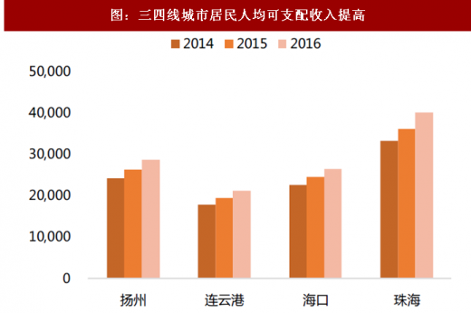 尽管近年来价格大幅下跌,但2016年9月以来,农村居民人均可支配收入增速持续上升。在政府政策的大力扶持下,农村居民收入并未收到近年食品价格大幅下跌的严重冲击;目前农产品价格已经逐步企稳,预期未来农村居民人均可支配收入将进一步上升。此外,与城镇居民不同,农村居民的边际消费倾向更高,收入增长更有助于全国消费的增长,消费场所也主要是其中在低线城市。