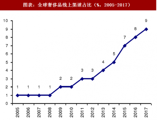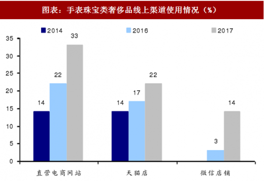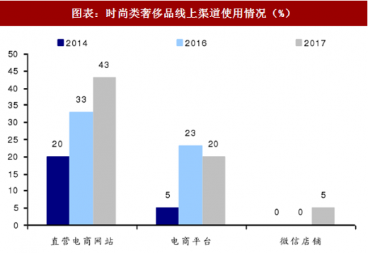 据纽约数字营销机构 l2 对在中国拥有业务的 47 个时尚和奢侈品牌和 42 个与品牌调查统计,2014 年仅 20%的时尚品牌和 14%的珠宝和手表品牌拥有直营电商业务,而 2017 各增至 43%和 33%;同时,奢侈品品牌正尝试通过微信尝试销售小批量的产品,2017 年 5%的时装品牌和 14%的手表&珠宝品牌正在考虑开设微信销售点。
