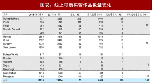 据巴黎银行对 2016/17 财年到 2017/18 财年间,线上可购买奢侈品数量的调查,按增速将 16 个品牌分类:仅 2 个品牌在调查期间减少了线上销售的奢侈品数量,其余 14 个均有增加,整体增长率 35%,表现多数品牌不断重视线上渠道建设,增加线上品类数。