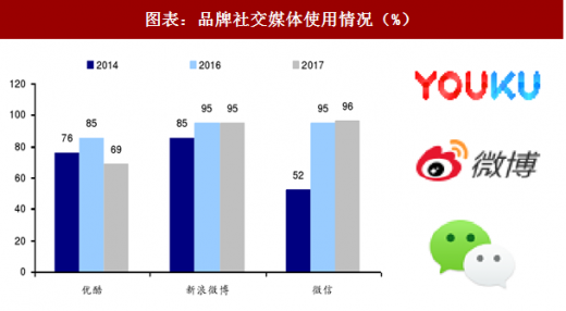 在营销方面,奢侈品品牌在更多利用数字化渠道和手段,微博和微信是使用最多的社交媒体。l2 调研显示,2017 年几乎所有调研品牌都采用了微信和微博进行营销。同时奢侈品品牌也正在向着更受欢迎的短视频和流媒体平台聚集。