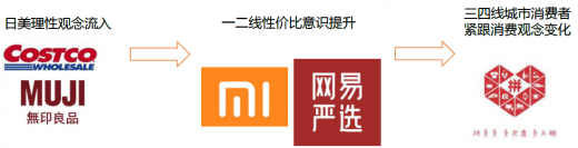 “低端”商业革命如何发展演变?我们认为注重性价比的理性消费观主要自海外(日美为主)输入,传播至国内一二线,最后将延展至国内低线城市。优衣库、无印良品进驻国内且得到快速发展,美国costco也于2016年11月进军线上,一定程度上证明源于日美“理性”消费观逐渐开始输入到国内,国内消费者(尤其是一线城市)也渐渐接受。近年来小米生态链、网易严选的崛起表明一二线城市消费者性价比意识提升,优质必然高价的陈旧观念不断淡化。拼多多的悄然风靡一定程度上显示了三四线消费者开始注重性价比,而非高端昂贵名牌和低端劣质无品牌的两极分化,未来预期对设计美感的追求也将不断提升。