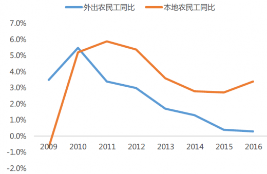 本地农民工人数增速高于外出农民工人数增速超2个百分点,说明三四线城市是农民工流出一二线大城市的主要目的地。根据统计局数据,我们可以从图中看到本地农民工同比增速显著高于外出农民工同比增速,2016年本地农民工增速达到3.44%。越来越多的农民工选择在就近的低线城市中就业。目前市场上对于流出一线城市的人口是否就是回到三四线城市存在疑虑,农民工增速数据证明三四线城市人口承接潜力仍然十分巨大。