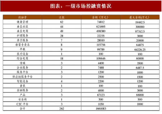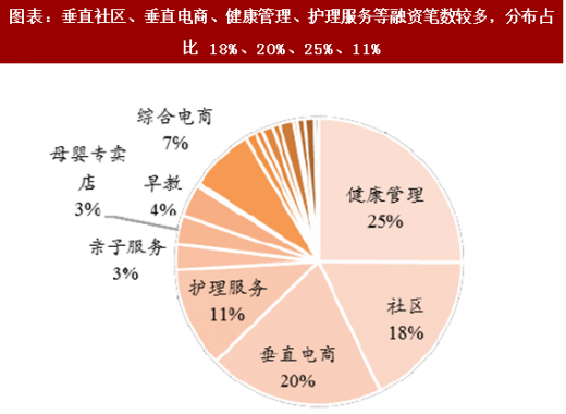 3)从投融资笔数分布来看,垂直社区、垂直电商、健康管理、服务等融资笔数较多,分布占比18%、20%、25%、11%。