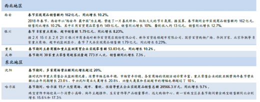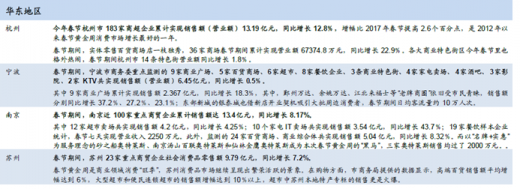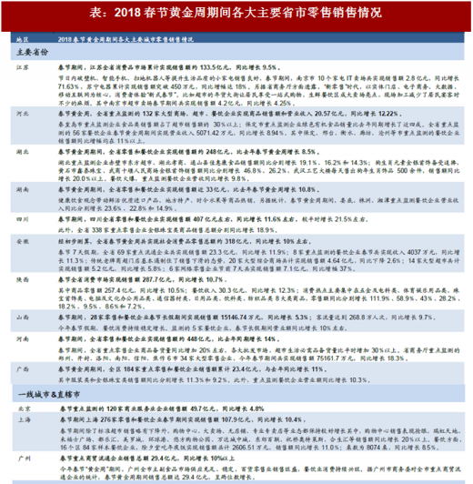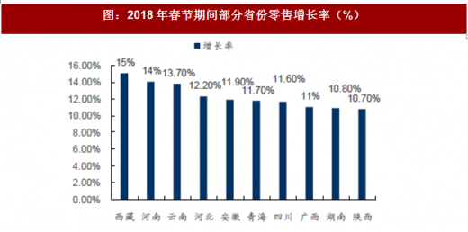 各省市来看,2018年春节期间中部主要区域除河南外,山西、湖北、湖南、安徽等区域增速均出现放缓,或受中部地区连续降水影响;而西部地区除陕西及广西地区出现增速小幅放缓外,其他区域均出现消费增速进一步提升。但整体来看,三四线地区销售额仍呈双位数增长,增势稳定。春节黄金周期间,西藏、河南、云南、河北、安徽重点监测零售企业销售额同比分别增长15%、14%、13.7%、12.2%和11.9%,青海、四川、广西、湖南、陕西分别增长11.7%、11.6%、11%、10.8%和10.7%。