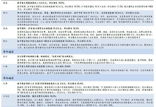 从部分一线及新一线城市来看,春节期间也均出现不同程度的消费增速放缓,或与庆祝春节方式发生变化有关,消费者更多选择出游或者观影来庆祝春节。一线城市春节销售额稳步增长,增速维持在10%左右。其中,北京市商务委重点监测的120家商业服务业企业实现销售额49.7亿元,同比增长4.8%,老字号销售收入继续保持两位数增长。上海市商务委抽样调查,276家零售和餐饮企业春节期间实现销售额107.9亿元,同比增长10.4%;广州市商务委对全市重点商贸流通企业统计,春节黄金周期间销售总额达29.4亿元,呈两位数增长。