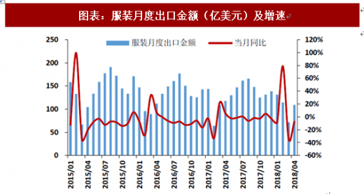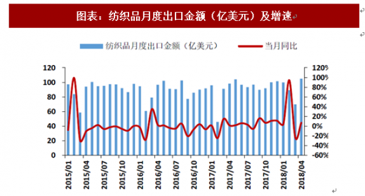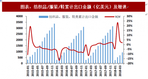 纺织服装出口整体呈现微涨趋势,18年1-4月份纺织品、服装及鞋类累计出口金额达932亿美元,同比增长1.67%。其中纺织品累计出口金额同比增长11.30%至363亿美元;服装累计金额同比降低1.4%至425亿美元;鞋类累计出口金额同比降低3.8%至142亿美元。4月份纺织品服装及鞋类出口金额同比下降3.44%,其中纺织品月度出口同比增长6.95%,服装和鞋类出口分别同比降低7.5%、16.7%。