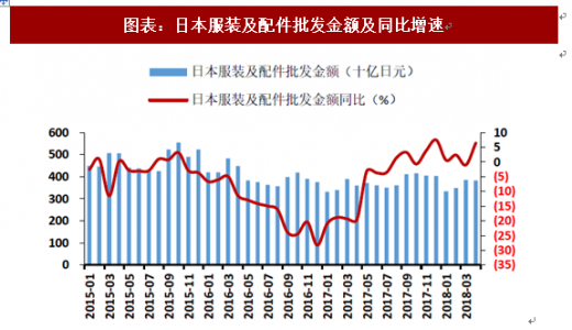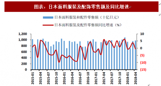 日本服饰需求低增速增长:在经历2017年最后两个月的中高个位数增长后,2018年日本服饰及配件需求冷却,维持低增速增长。4月服饰需求同比增长1.34%,较3月份增速下降1.03pct,其中面料服装及配件零售额达9760亿日元,同比下降0.51%,服装及配件批发金额则上涨6.39%至3830亿日元。