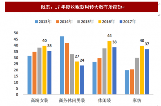 17以来,随着细分子行业高端女装、商务休闲男装、休闲装、家纺板块收入增速的提升,直营占比的提升,以及对商授信管理力度的加强,按总市值加权平均计算,整体回款周期缩短,应收账款占收入比重有所下降,高端女装表现最佳。17年高端女装加权平均账期缩短至35天(-5天);商务休闲男装账期缩短至24天(-3天);休闲装账期缩短至38天(-6天);家纺缩短至37天(-3天)。应收款收入占比方面,17年高端女装下降1.12pct至11.44%;商务休闲男装上升0.68pct至7.39%;休闲装下降3.69pct至9.62%;家纺下降0.74pct至11.19%。