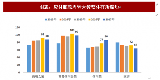 高端女装、商务休闲男装、家纺板块的付款周期均有所缩短,休闲装板块付款周期延长(森马因优化采购支付导致付款天数增加16天,比音勒芬和太平鸟基本不变)。一方面,我们认为付款周期的缩短与供货模式的变化有关。自16年以来,柔性生产模式在行业内兴起,并于17年在龙头企业推广开来,商通过降低首次下单比例,后续以小批量多批次快速补单的方式降低存货水平,并放大爆款销售效果。模式的变化需要制造商预留生产线,并加快回款速度进行提前备料,因此品牌商相应的需要增加付款频次。另一方面,终端销售情况好转,存货周转加快,直营占比提升以及加强经销商授信管理,加快了货款的回收,因此品牌商对供应商的付款也就更加积极。17年高端女装板块按总市值加权平均计算,应付账款周转天数下降4天至88天;商务休闲男装下降4天至99天;家纺下降8天至64天;休闲装增加9天至86天,主要因为森马服饰应付账款周转天数增加16天至72天所致,而太平鸟微降、比音勒芬基本保持不变。