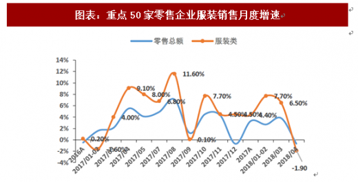 中观层面,2018年1-4月限上企业消费品零售总额累计同比增长8.4%,增速较17年同期提升0.2pct。限上鞋服、零售总额累计同比增长9.7%,其中服装类零售总额累计增速10.5%。4月份限额以上服装鞋帽针纺品类零售额同比增长9.2%,增速较去年同期下降0.8pct;服装类同比增长8.8%,增速较去年同期下降2.1pct。微观层面,2018年1-4月全国50家重点大型零售企业零售额累计同比增长2.6%,与上年同期相比增长0.6pct。4月份全国50家重点商企零售额同比降低0.6%、增速同比下降6.2pct。4月受天气变化影响、服装零售表现较弱,50家服装零售额同比降低1.9%,增速同比降低11pct。