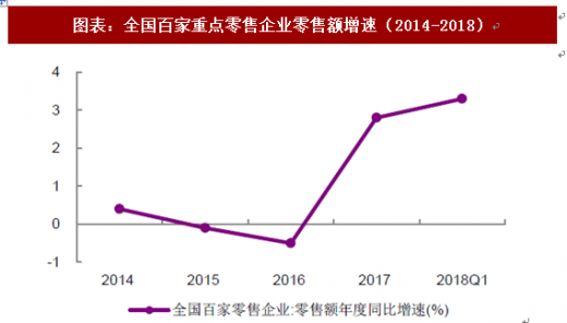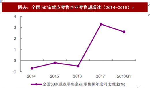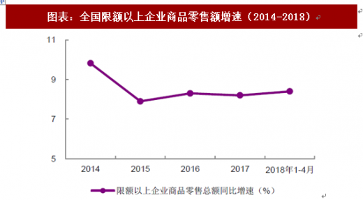 2018 年,中国市场继续弱复苏。根据国家统计局发布的数据,2018 年1-4 月,社会消费品零售总额同比增长9.7%,增速较上年同期下降0.5 个百分点。2018 年1-4 月,限额以上企业商品零售总额同比增长8.4%,增速较上年同期上升0.1 个百分点。根据中华全国商业信息中心发布的数据, 1q2018 全国50 家重点零售企业零售额同比增长2.6%,增速较上年同期上升0.6 个百分点。1q2018 全国百家重点零售企业零售额同比增长3.3%,增速较上年同期上升0.6 个百分点