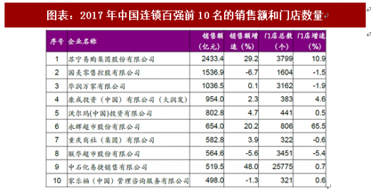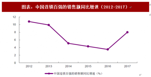 2017 年,中国主要零售企业的经营状况显著改善。根据中国连锁协会的统计,2017 年中国连锁百强合计销售额为2.18 万亿元,同比增长8.0%,增速较上年提升4.5 个百分点,门店数量为10.98 万个,同比增长9.1%。
