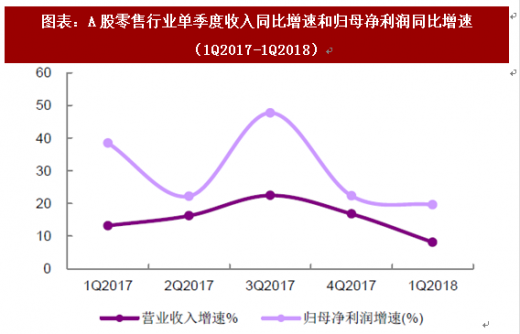 从2018 年一季度情况来看,1q2018 零售行业a 股上市公司整体的营收增速较4q2017 环比显著下降,归母净利润增速小幅下降。零售行业主要的82 家上市公司1q2018 实现营业收入3288.69 亿元,同比增长8.12%, 增速较4q2017 下降8.66 个百分点。实现归母净利润109.06 亿元,同比增长19.59%,增速较4q2017 下降2.74 个百分点。