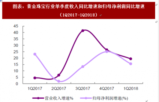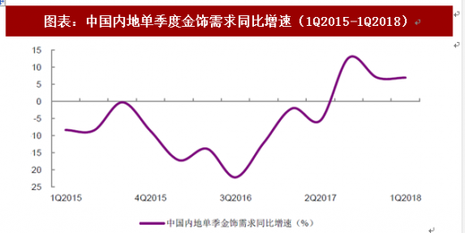 1q2018 金饰需求升至近三年高点,高增长奠定全年基调。据世界黄金协会统计,1q2018 中国内地黄金饰品需求量实现6.95%的良好同比增速, 显著领先全球水平(金饰需求同降0.79%)。内地金饰需求2017 年为648.2 吨,同比增长2.81%,考虑到需求量较2013 年的高点938 吨尚有较大空间, 以及一季度黄金珠宝乃至可选消费品整体的销售回暖,我们认为2018 全年黄金珠宝行业的复苏趋势仍将持续。