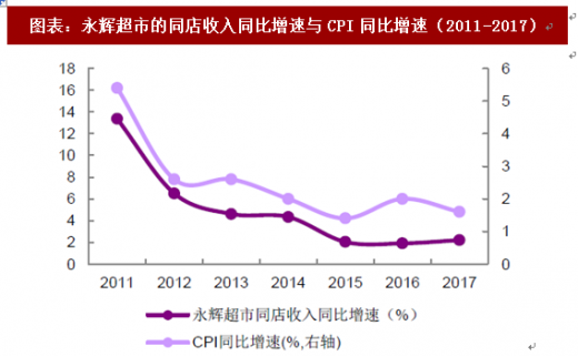 通胀处于较低水平,不利于同店增速的提升。2018 年以来,我国cpi 仍然处于较低的水平。根据国家统计局发布的数据,2018 年1-4 月,居民价格指数cpi 同比上涨2.1%,其中食品cpi 同比上涨1.7%。从历史上看, 超市企业的营收增速与cpi 增速在趋势上基本一致,cpi 处于较低水平,多数超市企业将有较大的经营压力。
