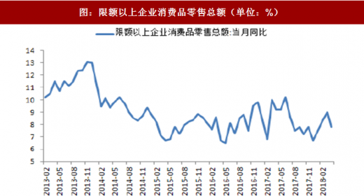 2018年1-4月份,社会消费品零售总额11.88万亿元,同比增长9.7%,实际增长8.1%。其中,限额以上单位消费品零售额4.61万亿元,增长8.4%。2018年4月份总额2.85万亿元,同比增长9.4%,实际增长7.9%;限额以上单位消费品零售额1.12万亿元,增长8.4%。