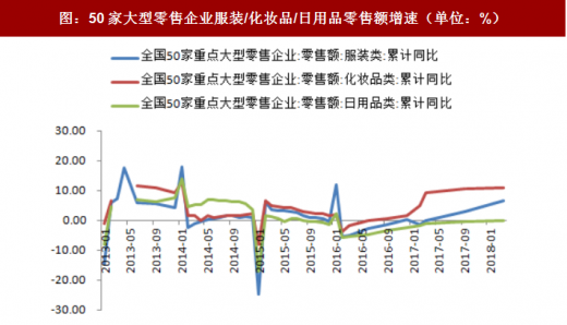 2018年1-3月50家重点零售企业服装类零售额同比增长6.5%,增幅大幅高于去年同期6.7个百分点;化妆品类零售额同比增长11.0%,增速高于去年同期1.2个百分点;日用品类零售额同比下降0.2%,降幅比去年同期收窄0.9个百分点。