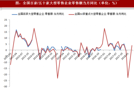 2018年1-3月全国百家重点零售企业零售额同比增长3.3%,增速高于去年同期0.6个百分点。2018年1-3月份全国50家重点大型企业零售额累计同比增长2.6%,增速高于2017年同期0.6分百分点。其中3月份全国50家大型零售企业零售额同比增长3.8%,增速高于2017年同期0.7个百分点。
