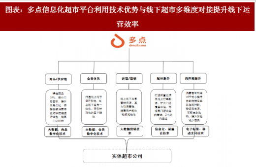 具体来看,我们选择以 2015 年 4 月上线的“多点”平台为例,线上平台与实体企业对接主要围绕商品供应链选品、会员体系搭建和针对性营销、基于线下门店和线上销售平台的仓配一体高效配送服务、以及基于 app 或小程序打造的自助收银等等,充分发挥线上平台的大数据、商品数字化、会员数字化、大数据精准营销、前置仓、电子价签及移动支付等技术,提升线下商品选品能力、会员管理能力、营销能力、区域辐射能力以及门店终端运营能力,以改善门店坪效及盈利效率。