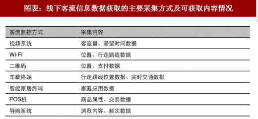 在此基础上,其他的技术型企业也在围绕着实体企业信息化能力提升方面进行布局,其中最为核心的即为对线下消费者数据的采集与跟踪,目前已经根据生活场景和交互节点利用多种传感终端获取多维度的数据,包括视频系统来跟踪消费者的停留时间、wifi 终端跟踪行走路线、二维码跟踪支付、车载系统跟踪行走路线与位置数据、pos 机获取商品交易与属性数据、导购系统获取关心内容与频次数据以及逐渐发展起来的智能家居系统来获取家庭应用数据,实现全方位的对消费客群的把握,进而帮助选品、营销等。