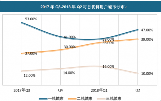 随着大数据、技术、冷链技术的不断发展,生鲜水果的电商交易也逐步优质化,由此市场上也涌现了越来越多的生鲜电商,带动了消费升级。随着物流、配送体系的逐渐完善,生鲜电商的服务范围正在逐步扩大。通过对生鲜电商主力消费人群所在区域进行分析,一线城市以群众消费基数大、配送便捷等特性,一线城市目前仍然是生鲜电商争夺的主要场所,随着二线城市的消费潜力的逐步提升,二线城市的渗透率也呈持续上升态势。以每日优鲜为例,2017年q3,其在二线城市的用户占比为 27%,而到 2018 年 q2,该数据已上升至 39%。