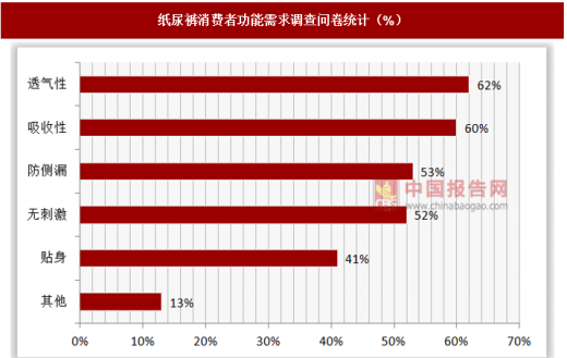 不同的消费者对于纸尿裤的功能需求存在着一定的差异性,但总体来说,透气性、吸收性、防侧漏、无刺激和贴身这五大功能需求是最多的。有调查问卷显示,62%的顾客对于纸尿裤的透气性功能有需求。