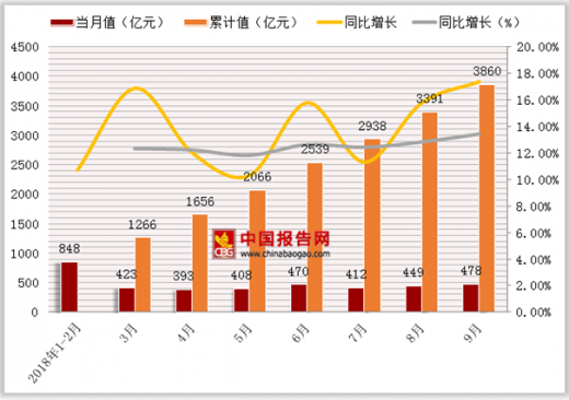 2018年9月份日用品类零售额达478亿元,与去年同期相比增长17.4%。2018年1-9月全国日用品类零售额达3860亿元,同比增长13.4%。