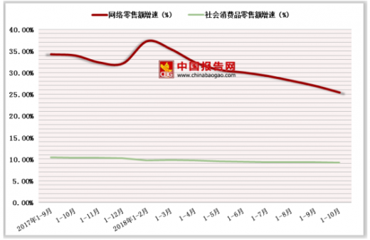 从增长速度来看,随着信息技术的进步和网络覆盖范围的扩大,尤其是国家对农村地区网络建设的支持力度不断加大,网络购物用户规模持续壮大,网络零售额增速远远超过社会商品零售总额的增速,但今年的增速有所放缓。具体来看:2018年1-10月,网络零售额同比增长速度达到25.5%。