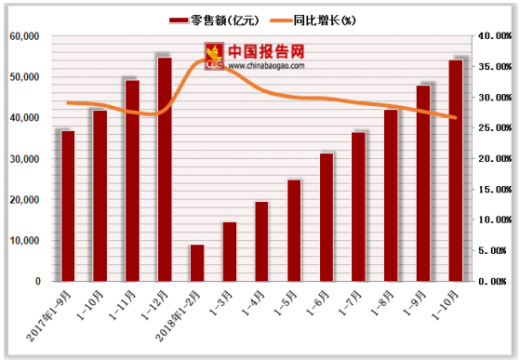 2018年1-10月份,全国网上零售额70539亿元,同比增长25.5%。其中,实物商品网上零售额54141亿元,增长26.7%。