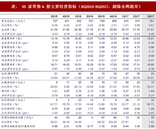 剔除永辉超市后,2017年前三季度营业收入同比增长1.62%,较2016年同期增加2.78个百分点。同时,一、二、三季度收入各增-1.91%、3.9%、3.61%,二季度仍显著改善,三季度延续趋势。