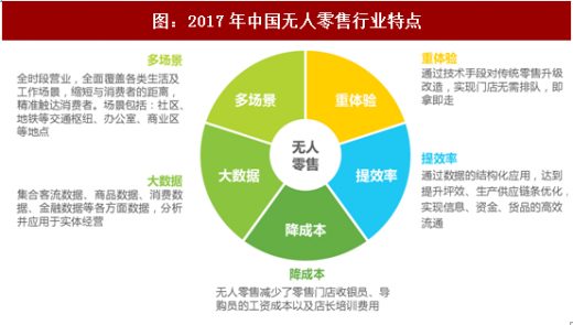 当前中国无人零售行业主要呈现五大特点:以降低人工成本作为无人零售的主要切入点,在重视消费体验,拓展零售场景的同时通过多种技术手段实现大数据的收集、分析与应用,并最终实现消费流程的全面数据化以及整个产业链的智能化升级提效。艾瑞分析认为,零售产业链的全面数据化才是无人零售背后的战略核心,包括客流数据、商品数据、消费数据、金融数据等的全面融合与应用。