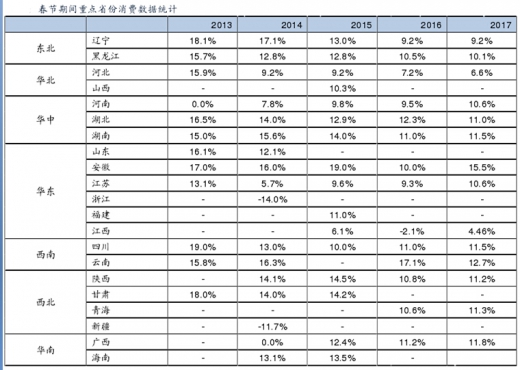 从省级数据来看,中西部地区大多省份春节消费数据出现明显提振,河南2017年春节重点监测商贸企业销售额增速为10.6%( 1.1pp)、四川为11.5%( 0.5pp)、湖南为11.5%( 0.5pp)、青海为11.3%( 0.7pp)、陕西为11.2%( 0.4pp)。增速下滑的省份有湖北和云南,分别为11%(-1.3pp)和12.7%(-4.4pp)。从城市数据来看,重庆2017年春节销售额同比增长12.9%( 0.3pp),成都为7.1%( 0.3pp),均有较好表现。