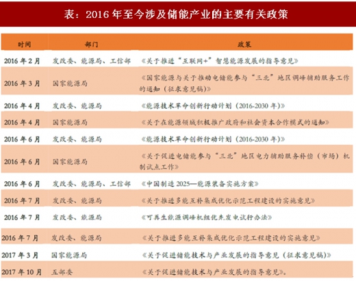 2017年10月,国家发改委、财务部、科技部、工业和信息化部和国家能源局联合发布《关于促进储能技术与产业发展的指导意见》,乃是我国出台的首个专门针对储能行业的政策文件。《意见》明确了储能在我国能源产业中的战略定位,并提出建立补偿机制,引导社会投资,推进市场改革;预计储能行业将在近年迎来政策支持高峰,有望推动储能技术与相关产业加速发展。