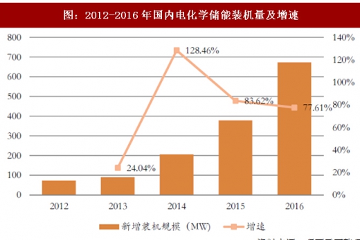 储能的技术路线包括电化学储能、飞轮储能、相变储能、压缩空气储能、储能等类别,其中电化学储能是目前规模占比最大的一类储能技术,也是行业未来的重点发展方向。锂电储能领域近些年实现快速增长:2012年到2016年新增装机规模复合增长率高达56%。电池储能的相关项目也在积极开展,mercom资本相关报告显示,在全球范围内,2017年1月-9月的电池储能风投金额达到5.63亿美元,同比增长169.39%。在政策鼓励以及资本支持下,预计2017年储能相关产业将出现快速的增长。