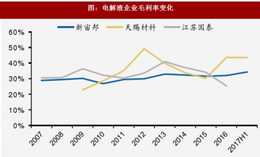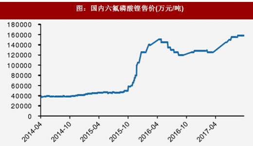 2015年三季度,价格随着原材料六氟磷酸铿的价格不断上涨,并从2016年二季度开始六氟磷酸铿的价格下降而逐渐下行,至2017年二季度价格断崖式下跌,电解液价格随之下调。