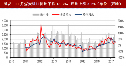 图表:11月煤炭进口同比下跌18.2%,环比上涨3.6%(单位:万吨)
