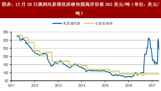 图表:12月28日澳洲风景港优质硬焦煤离岸价报263美元/吨(单位:美元/吨)