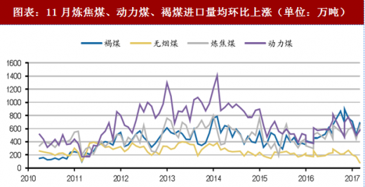 图表:11月炼焦煤、动力煤、褐煤进口量均环比上涨(单位:万吨)