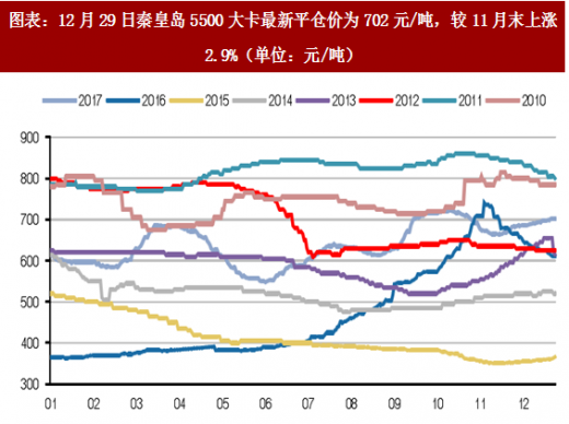 图表:12月29日秦皇岛5500大卡最新平仓价为702元/吨,较11月末上涨2.9%(单位:元/吨)
