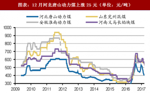 图表:12月河北唐山动力煤上涨25元(单位:元/吨)