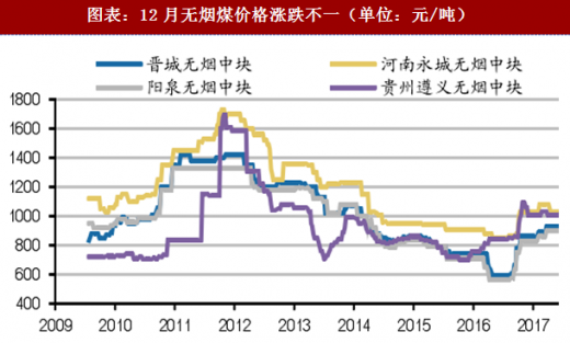 图表:12月无烟煤价格涨跌不一(单位:元/吨)