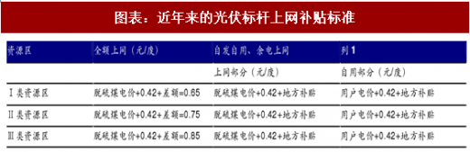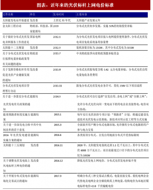 2013 年 3 月 11 日,发改委发布《关于完善光伏发电价格政策通知》,目前我国一类至三类资源区光伏电站的标杆上网电价分别为每千瓦时 0.65 元、0.75 元、 0.85 元,比 2016 年电价每千瓦时下调 0.15 元、0.13 元、0.13 元。低于预期的下调幅度在很大程度上促使了光伏产业在 2017 年保持快速发展。