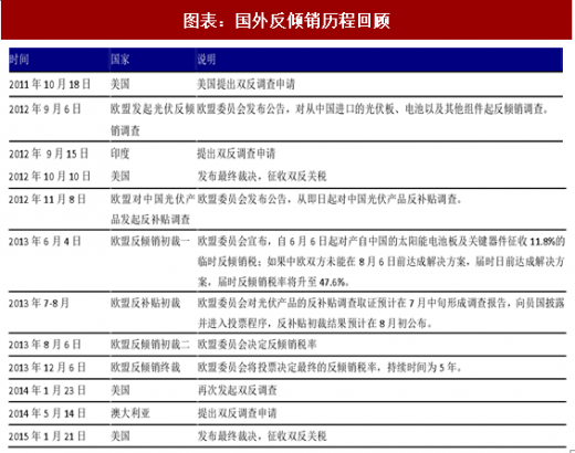 我国光伏产业从 20 世纪中期起步以来,经历了缓慢、快速、瓶颈三个发展阶段。快速发展的同时也带来了诸多问题,如产业政策脱离现实、产业链发展不均衡、产能过剩等,最终导致我国光伏产品的出口价格急剧下降,由此引发了 2012 年以来欧美等国对我国光伏产业的多次双反调查。高关税的征收使我国光伏产品失去了出口价格的国际竞争力,出口量急剧下降,光伏企业也出现了大面积的倒闭,由此给我国光伏产业带来了沉重的打击,影响了我国战略性新兴产业的发展。