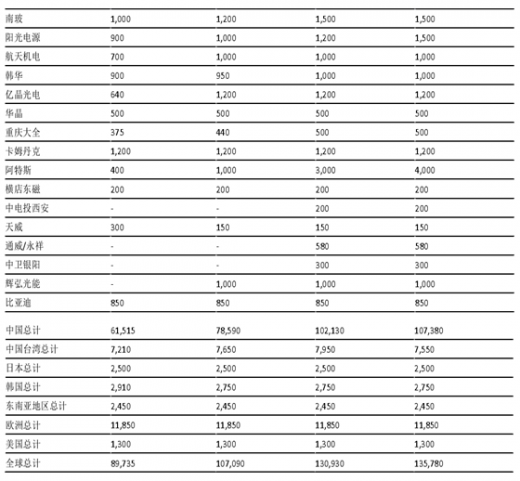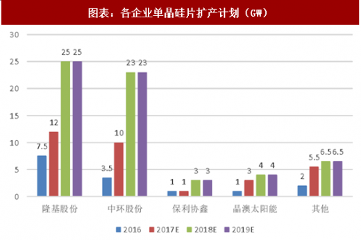 2017 年硅片行业主要扩产在单晶硅片领域。其中隆基股份预计今年会达到 12gw 的产能,中环股份达到 10gw 的产能;2018 年,隆基股份预计达到 25gw 的产能,中环则达到 23gw 的产能。预计 2017 年底中国单晶硅片产能能到 40gw 左右,2018 年底达到 72gw。多晶硅片方面的扩产产能不多,但是 2017 年产能比单晶硅片还是要多。2016 年国内主要企业多晶硅片产能约为 50gw 左右,其中保利协鑫产能为 17gw,占比高达近 34%;预计 2017 年年底国内多晶硅片产能达 65gw 左右, 2018 年国内多晶硅片产能为 68gw 左右。2018 年,单晶硅片的产能将超过多晶硅片,硅片领域竞争将会加剧。硅片供给中国目前占全球的大部分,全球其他国家几乎没有扩产计划,因此,2018 年全球硅片的扩产主要来自于中国。